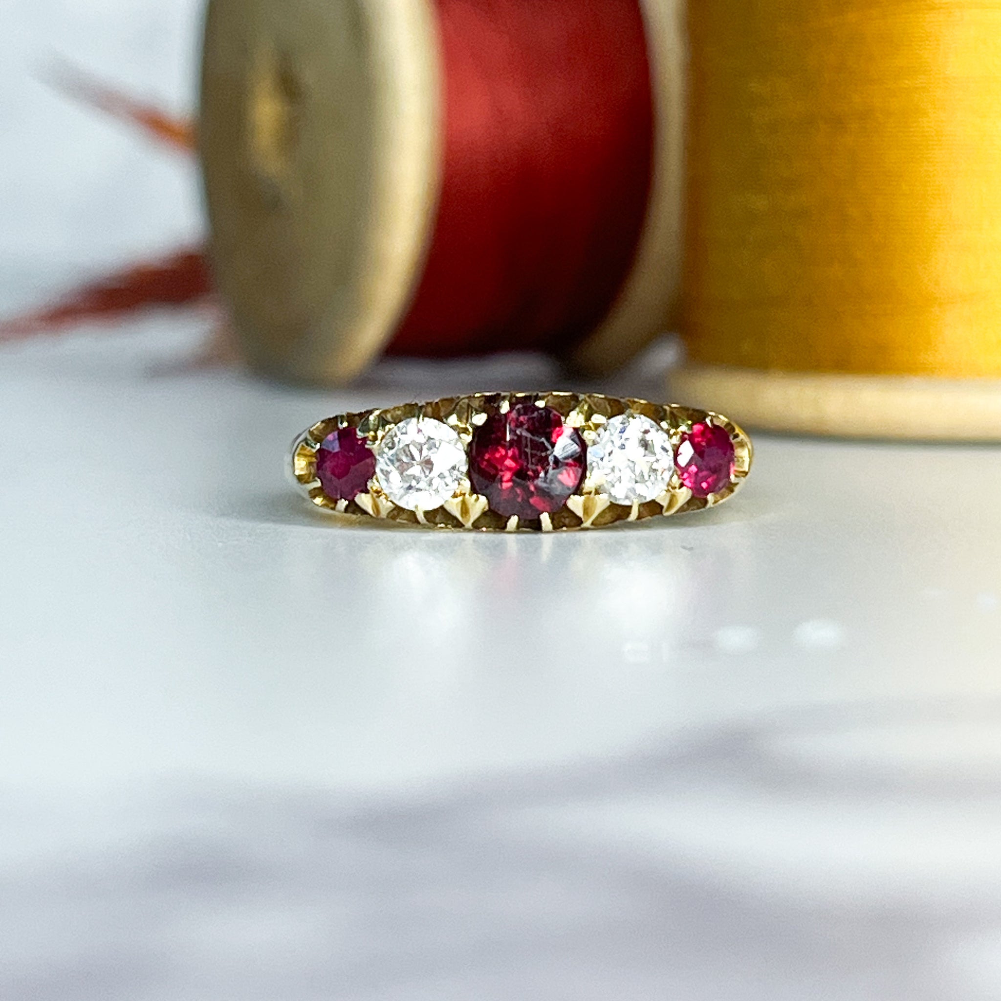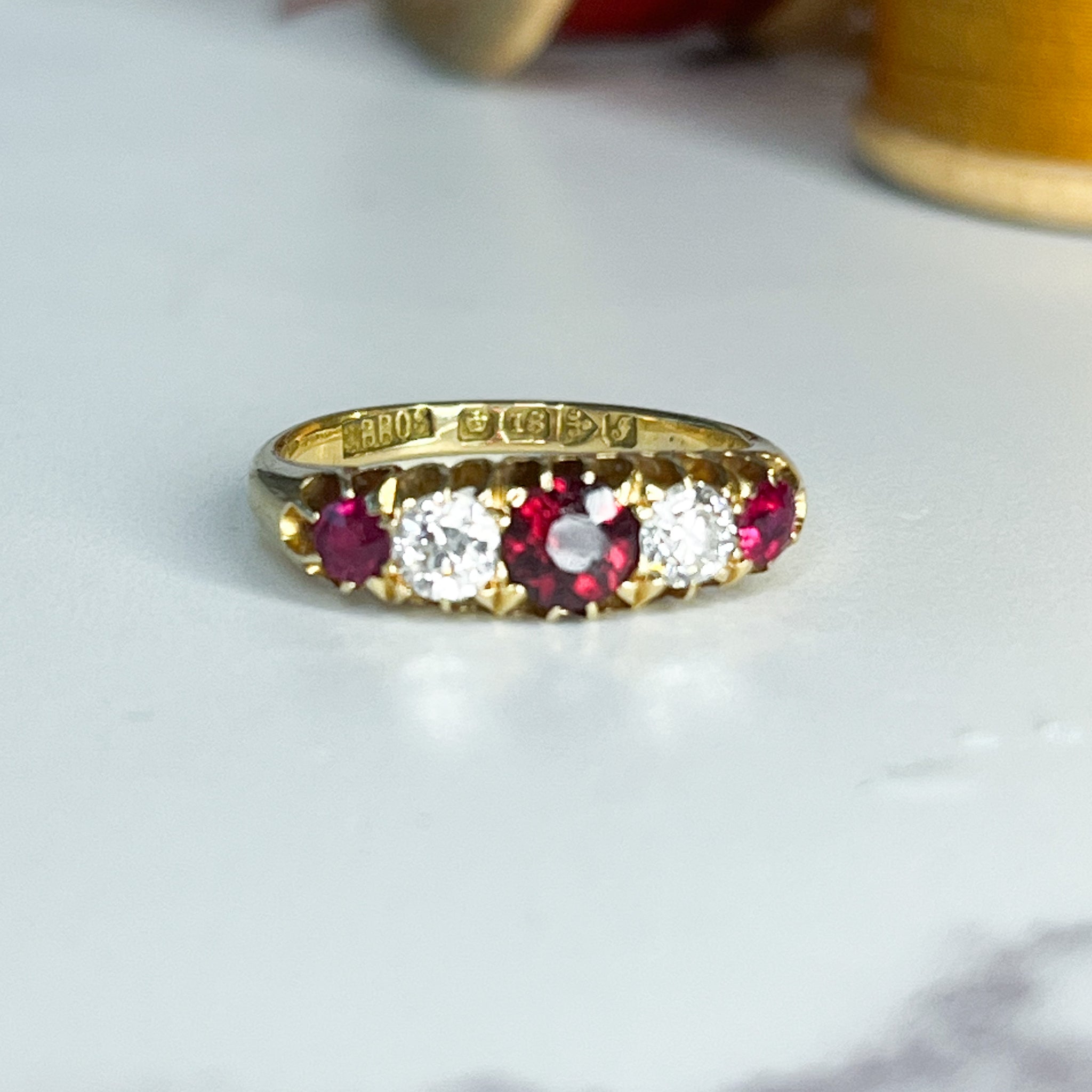 This elaborate 18ct gold ring is set with three rubies, totalling c.0.50ct, and two beautiful Antique Old European Cut Diamonds, totalling c.0.40ct. Hallmarked Chester, 1909, this Edwardian half hoop ring has an elaborate open claw setting, which displays these chunky gemstones beautifully on the hand.