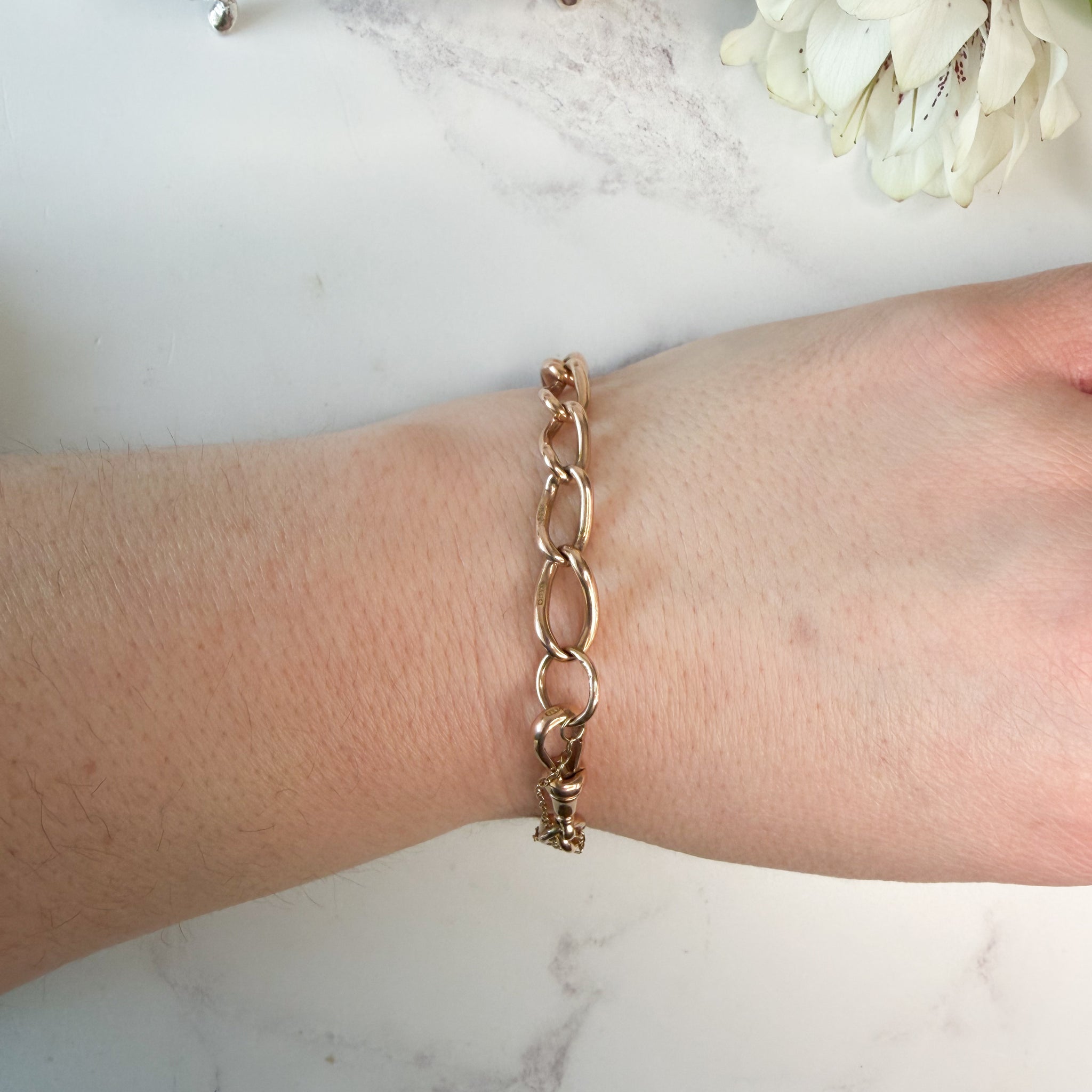 The bracelet fastens securely with a dog clip and safety chain, typical of the period, and has a satisfying weight and presence on the wrist. Its timeless design makes it perfect for both everyday wear and layering with other antique pieces.