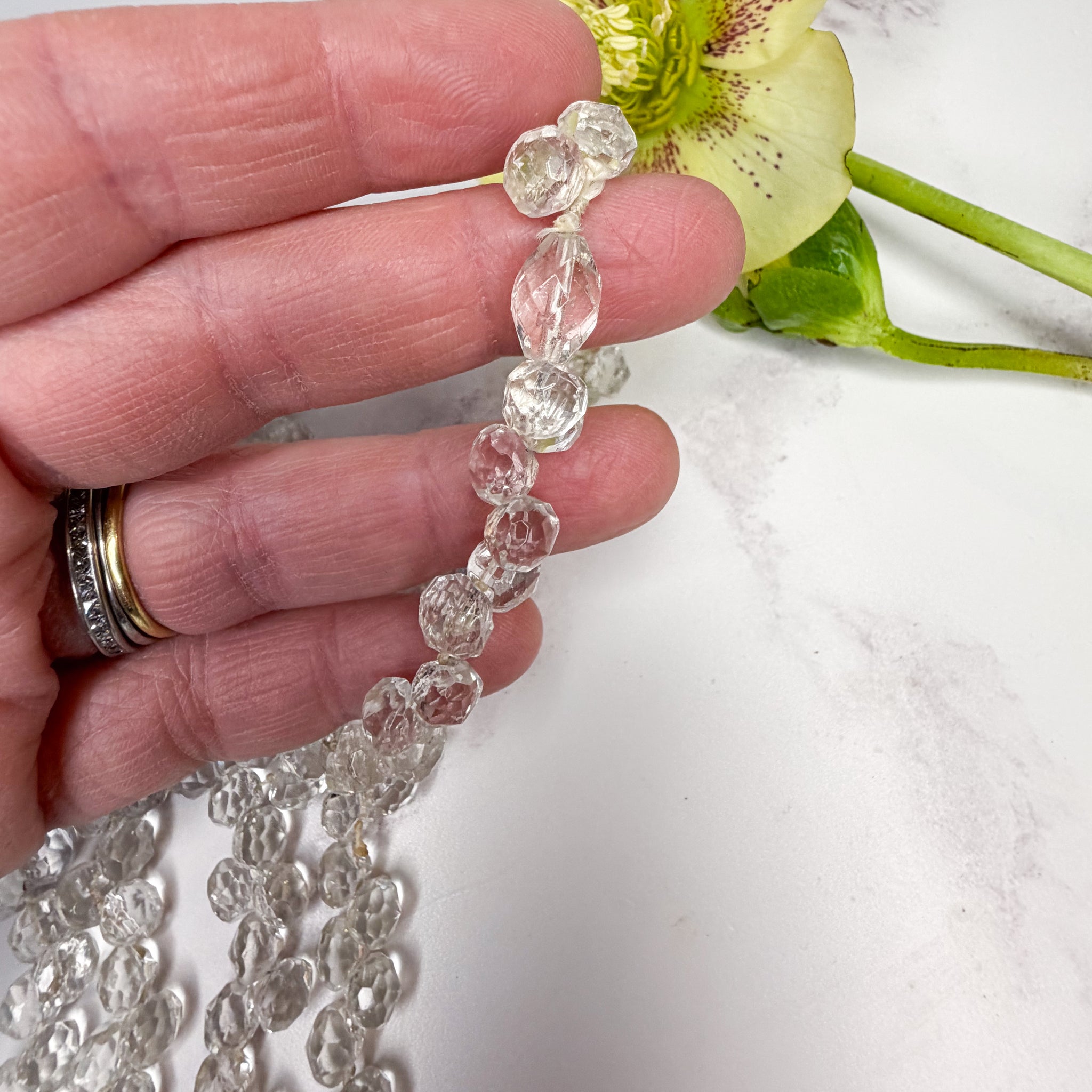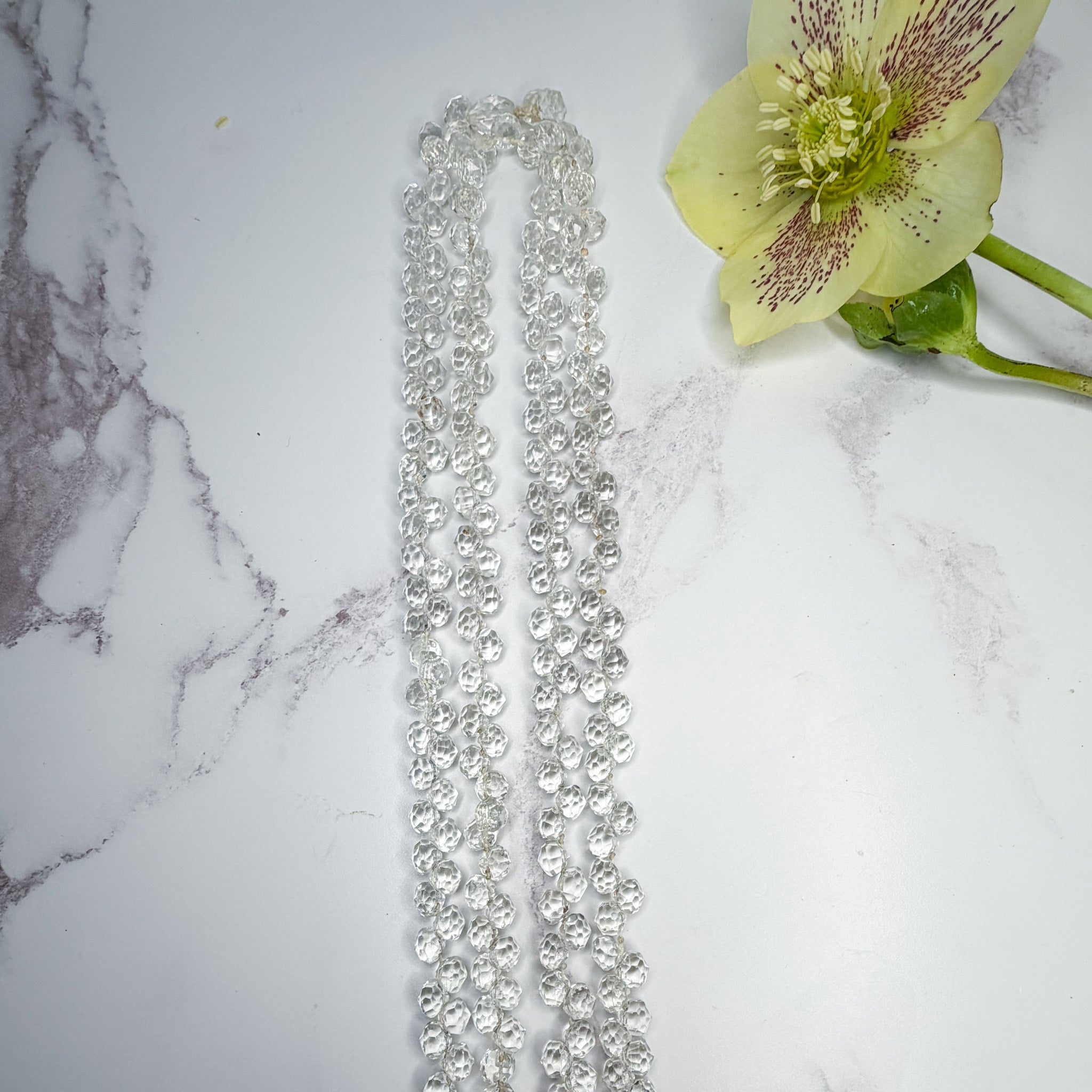 This is a really special one of a kind Art Deco glass bead necklace, hand made with love and care over 100 years ago. This charming necklace is made of hand faceted briolette glass beads, strung by hand on to an opera length string. These top bead is intentionally cut in a different design to mark the top of the piece. This necklace can be worn as one long string or a double row and has a beautiful unique sparkle on the neck. This is a unique and special necklace which deserves to be treasured for years to come.